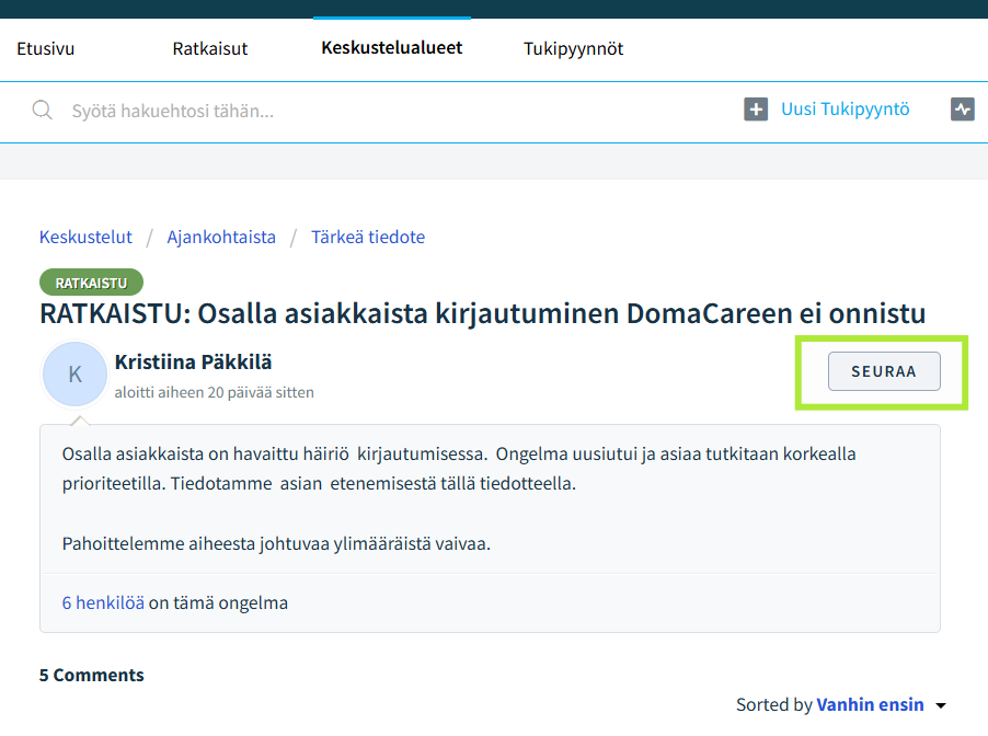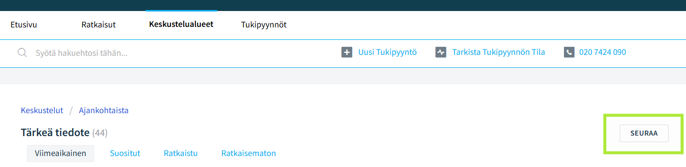 Tukisivujen Ajankohtaista-osiossa voit seurata tärkeitä tiedotteita, päivitystiedotteita ja muita ajankohtaisia uutisia. Tärkeät tiedotteet -osiossa tiedotamme ohjelman mahdollisista häiriöistä, Uutiset-osiossa ajankohtaisista asioista ja Päivitystiedotteet-osiossa tuotteen uusista ominaisuuksista ja korjauksista. Voit seurata joko yksittäisiä tiedotteita tai koko aluetta - huomioithan, että mahdolliset myöhemmät vastaukset tiedotteeseen saa sähköpostiin vain, jos seuraat erikseen ko. tiedotetta.