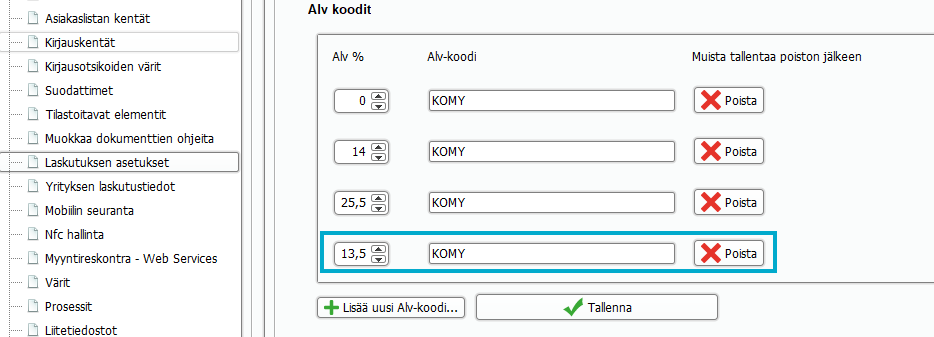 9. Mene Arvonlisävero % kentän kohdalle ja ota täppä pois Käytä oletusta laatikosta ja aseta vanhan veroprosentin tilalle uusi arvonlisäveroprosentti 13,5 ja Tallenna: