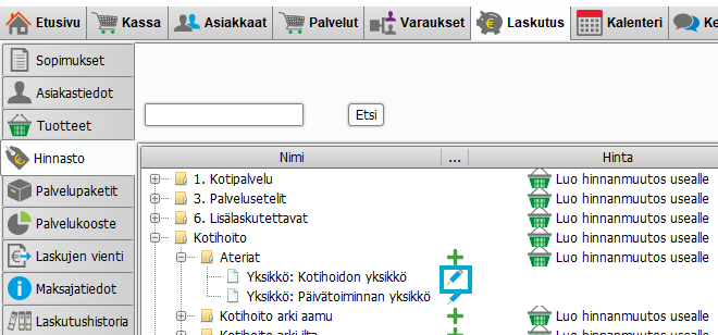 Siirry Laskutus -välilehdelle - valitse vasemmalta Hinnasto