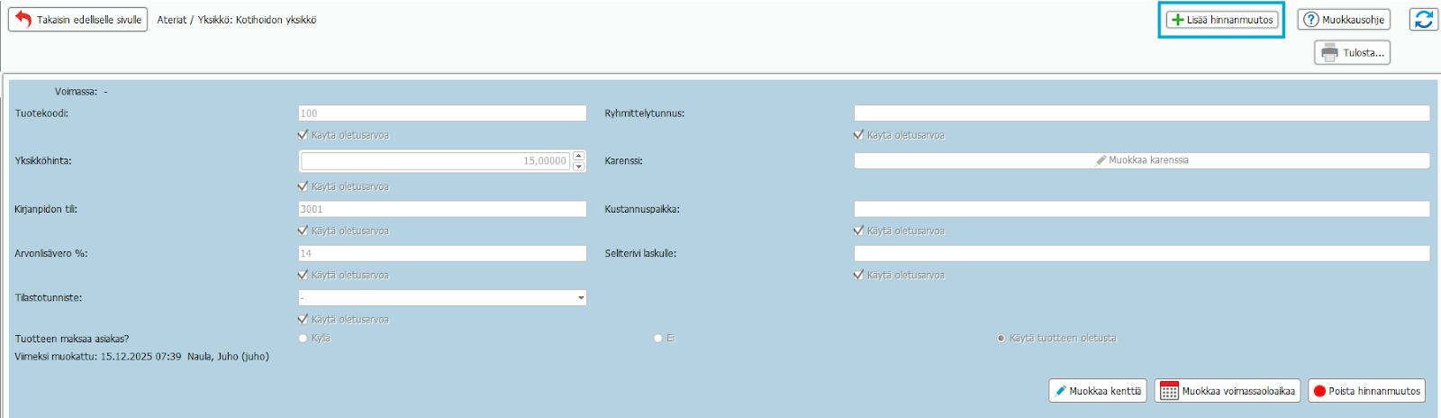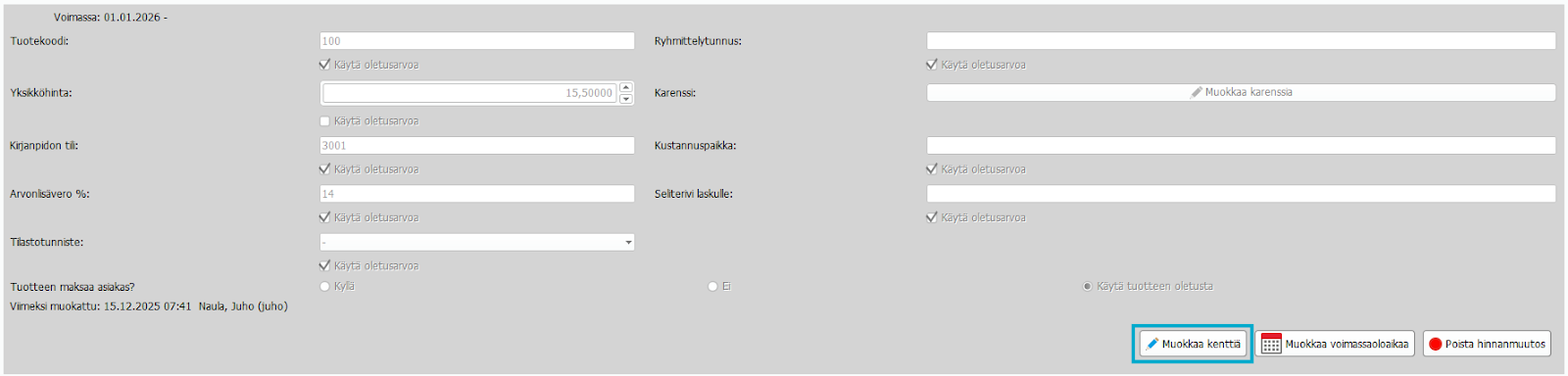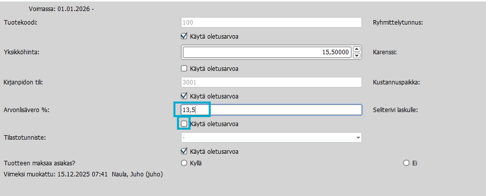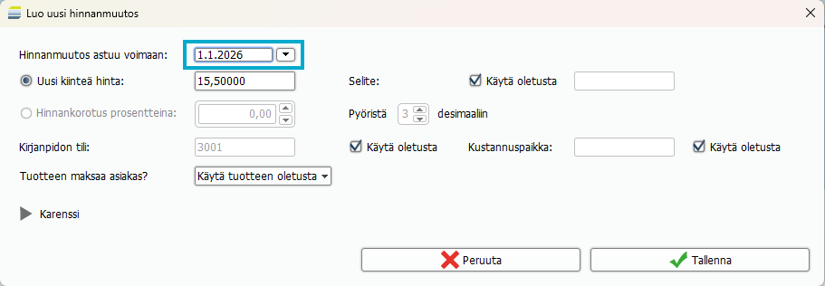 7. Täytä kohtaan: Hinnanmuutos astuu voimaan: 1.1.2026 ja Tallenna.