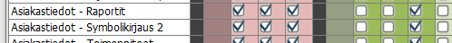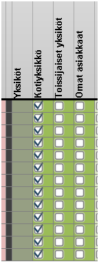 Yksiköt -oikeudet (tummalla vihreällä) määrittää koskeeko oikeus käyttäjälle määritettyä kotiyksikkö vai toissijaista yksikkö. Omat asiakkaat oikeus -> Työntekijä näkee vain hänelle lisätyt asiakkaat ja niihin liittyvät tiedot oikeustason mukaisesti. Kun käytetään Omat- asiakkaat oikeustasoa ja Varaukset-toimintoa annetaan näille työntekijöille Muokkaa varausosion 6/8 sivulla oikeudeksi Näytä.
