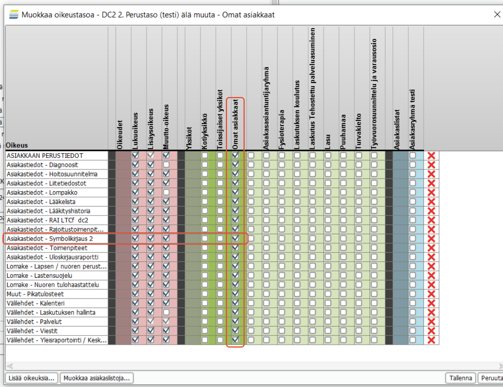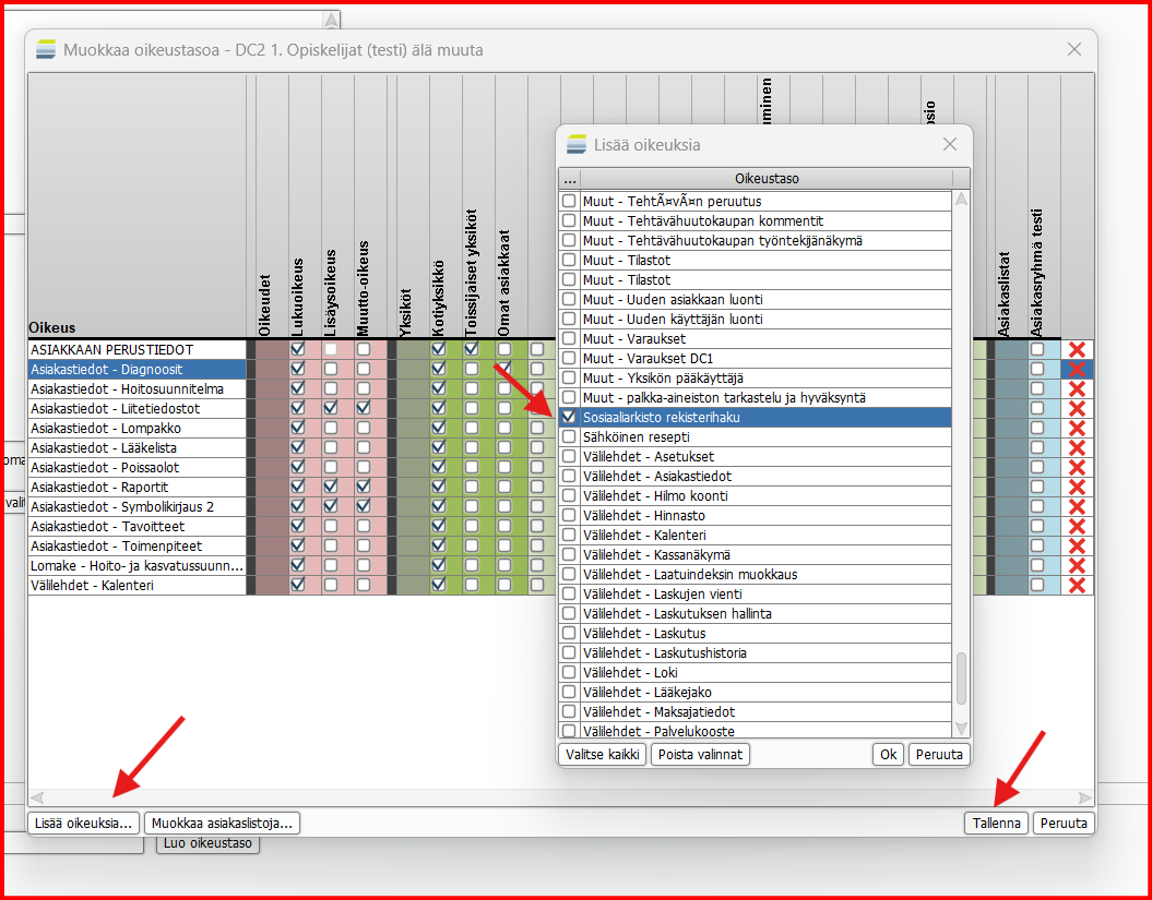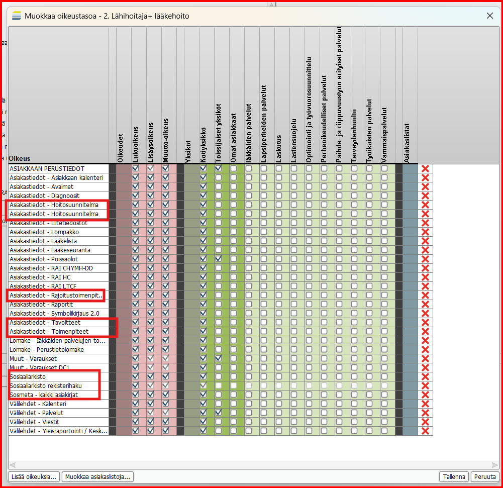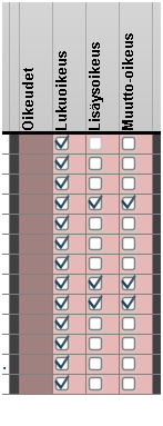 Oikeudet -osiossa (punaisella) määritetään onko oikeustasolla luku-, lisäys- vai muokkausoikeus ks. oikeuteen.