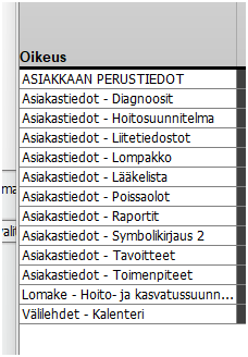 Oikeus -lista kertoo mitä oikeuksia on kyseisellä oikeustasolla käytössä.