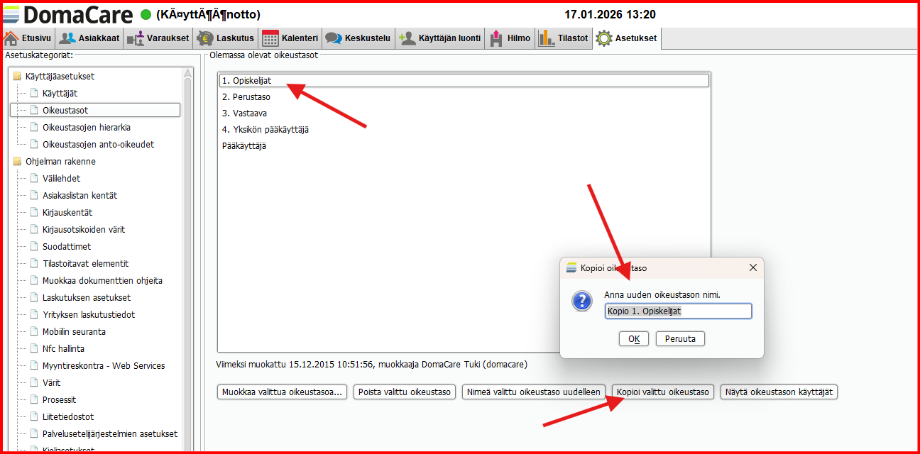 2) Kopio esim. joku perustason oikeustaso valitsemalla oikeustaso ja kopio valittu oikeustaso