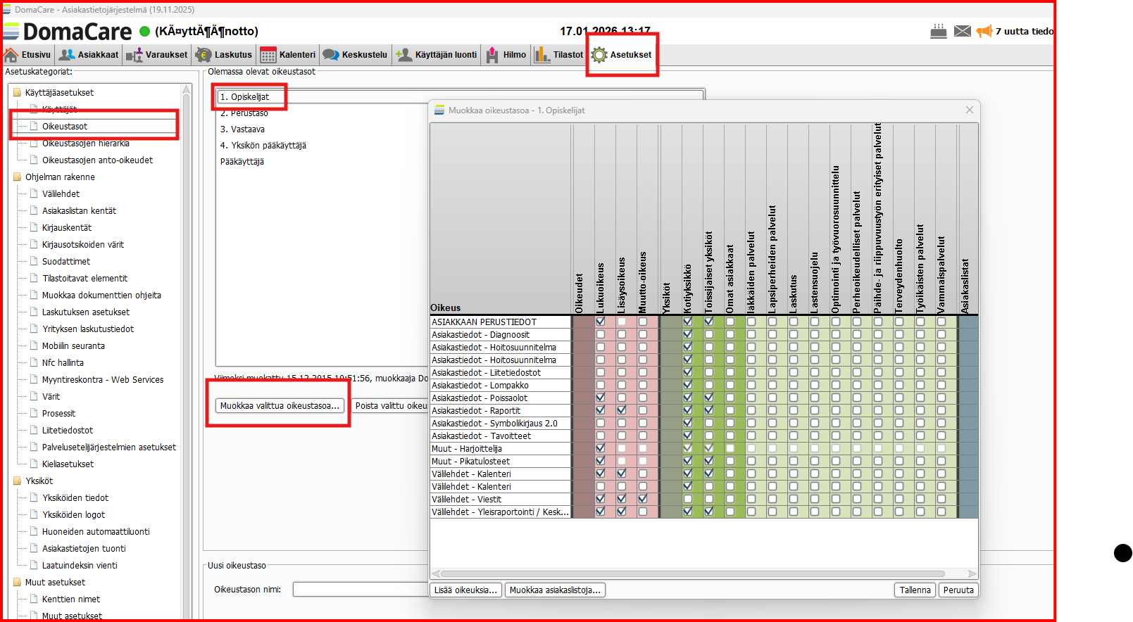 1) Asetukset - oikeustasot