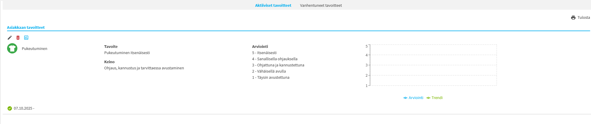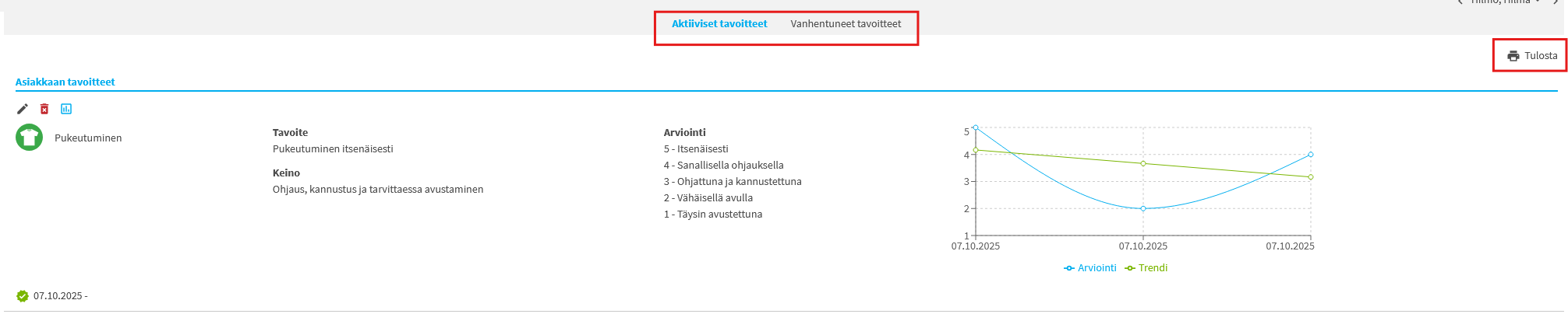 Tavoitteet-osiossa aktiiviset tavoitteet ja vanhentuneet tavoitteet ovat jaettu omille välilehdilleen. Tavoitteet voit tulostaa oikean yläkulman Tulosta-painikkeesta.