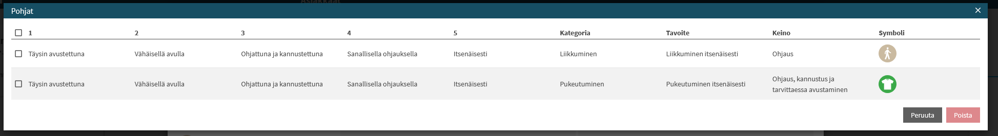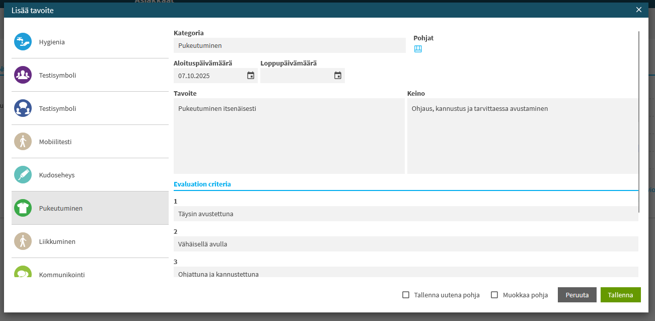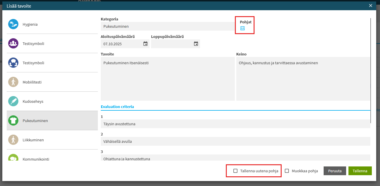 Lisää haluamasi pohja klikkaamalla kyseistä tavoite-pohjaa valikossa, jolloin pohjaan kirjattu tavoite, keino, kategoria ja arviointiasteikko siirtyvät tavoitteen luonti-ikkunaan. Tämän jälkeen tallenna tavoite.