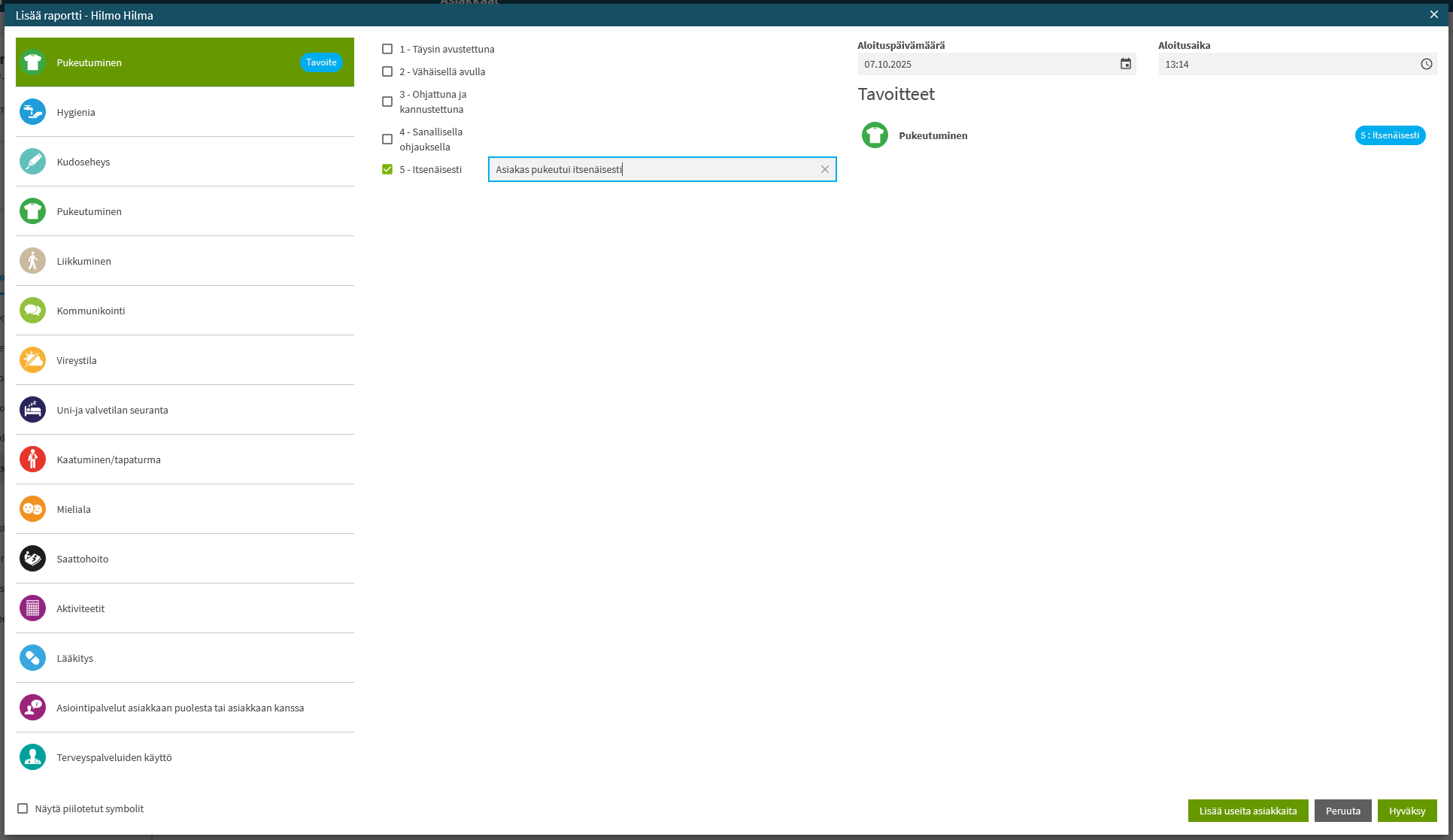 Kun tavoite on luotu, pääset arvioimaan tavoitteen edistymistä Kirjaukset-ominaisuudessa. Valitse Lisää raportti-painike, jolloin avautuvan kirjausikkunan vasemman laidan symboli-valikossa on ylimpänä ko. asiakkaan tavoitteet.