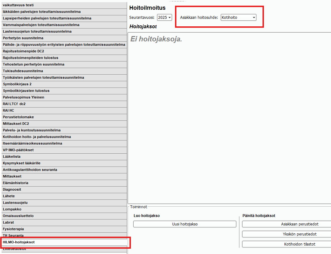 - Valitse asiakkaalle Kotihoidon-hilmotyyppi asiakassivun HILMO-hoitojaksot välilehdellä