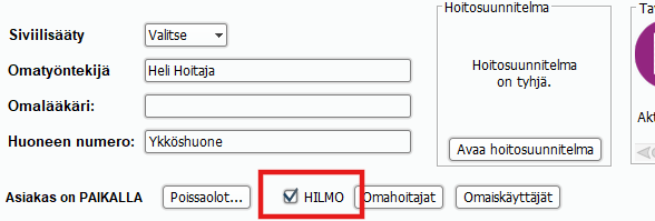 - Lisää asiakassivun ylälaidassa olevaan Hilmo-kohtaan täppä