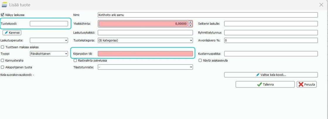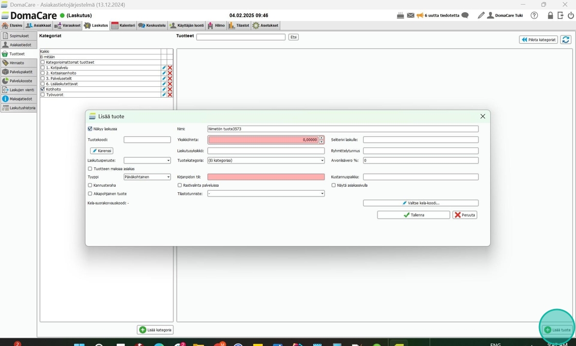 5. Anna tuotteelle Nimi, sekä Tuotekoodi ja kirjanpidontili, mikäli teillä on käytössä DomaCaren kautta integraatio talouden järjestelmäänne. Nämä koodit ja tilit saatte taloushallinnon järjestelmästänne tai kirjanpitäjältänne.