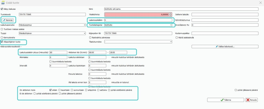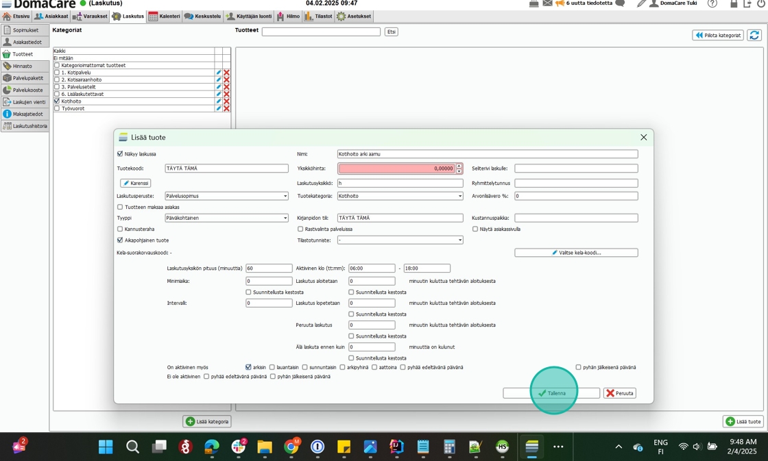 Esimerkki: Kotihoito arki aamu tuote (kuvassa) päättyy klo 18:00. Mikäli teillä tehdään myös iltakäyntejä eri hinnalla, niin tehkää toinen tuote (esim. kotihoito arki ilta), jonka voimassaolo alkaa klo 18:00 ja asettakaa päättymisaika.