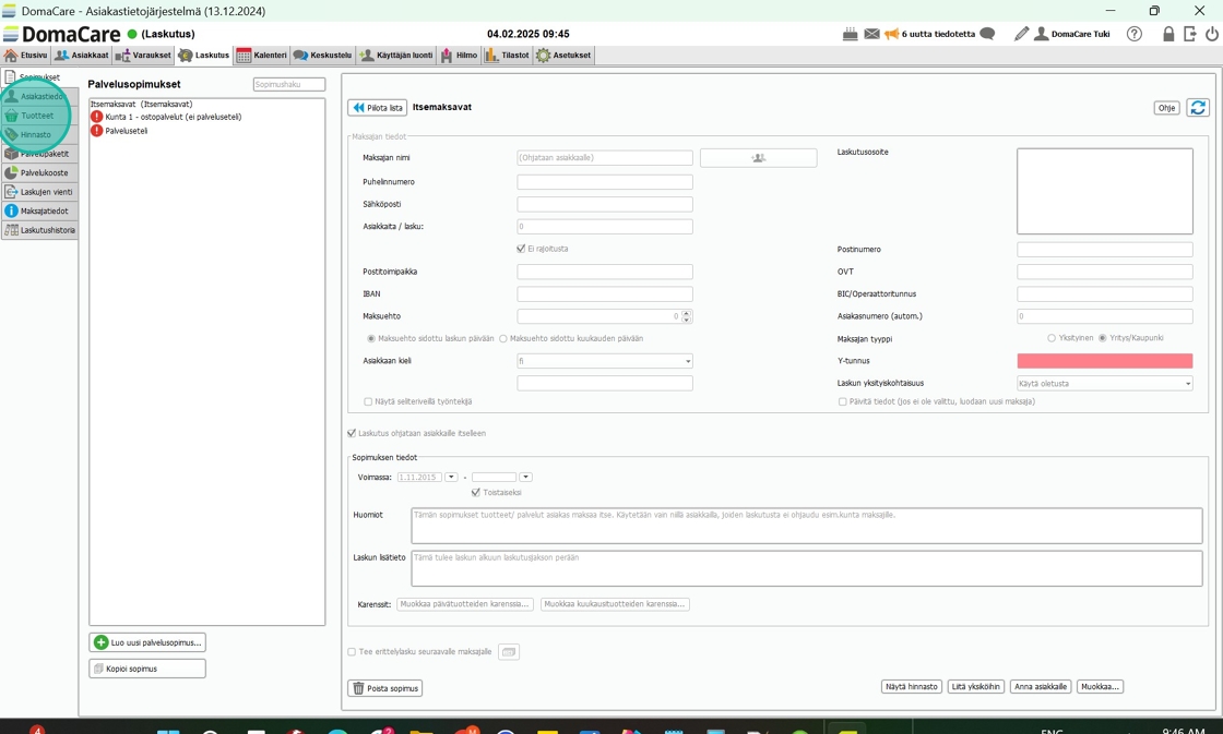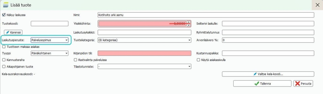 Tuote hinnoitellaan vasta sopimuksella, jotta voitte käyttää samaa tuotetta useilla eri sopimuksilla eri hinnoilla. Ja mikäli laskut pitää ohjata sopimusten avulla eri maksajille niin valitse laskutusperusteeksi palvelusopimus.
