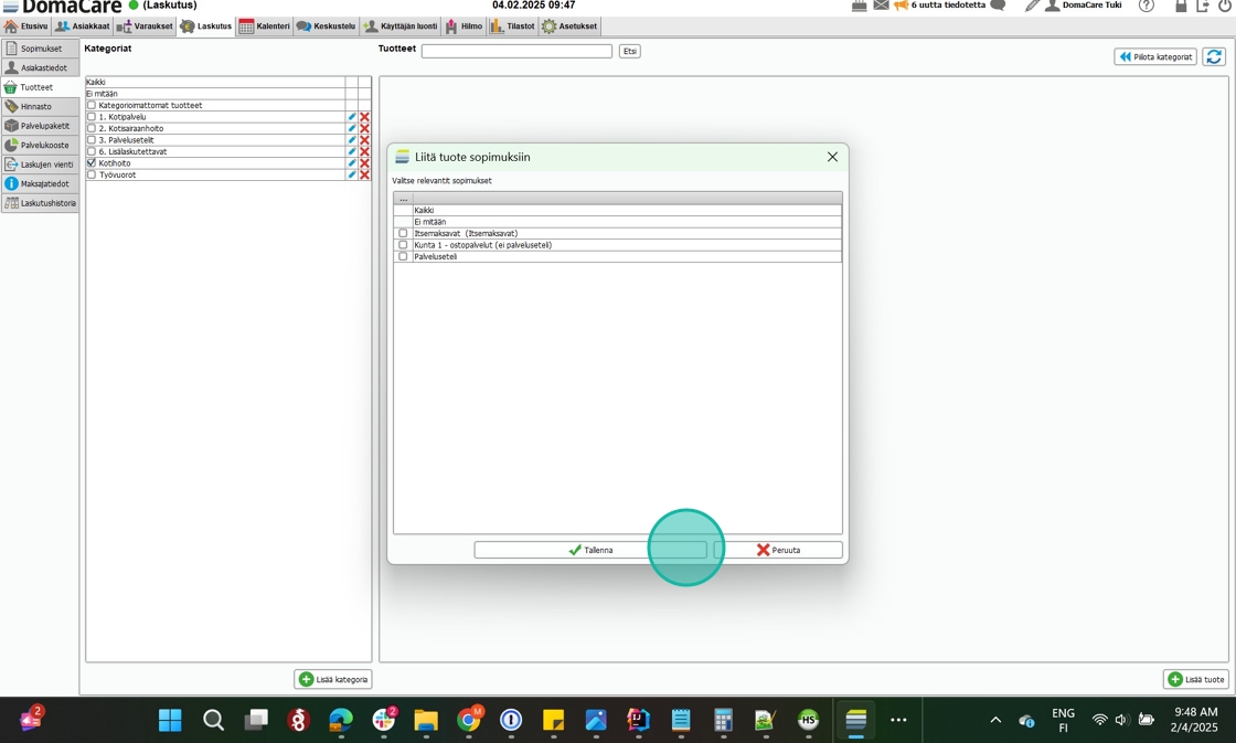 10. Eteesi aukeaa ikkuna, jossa voit liittää juuri tekemäsi tuotteen suoraan sopimuksille. Voit myös painaa ruksista, jos et halua vielä lisätä tuotteita sopimuksille. Tuotteet voidaan lisätä sopimuksille suoraan myös sopimusten kautta myöhemmin.
