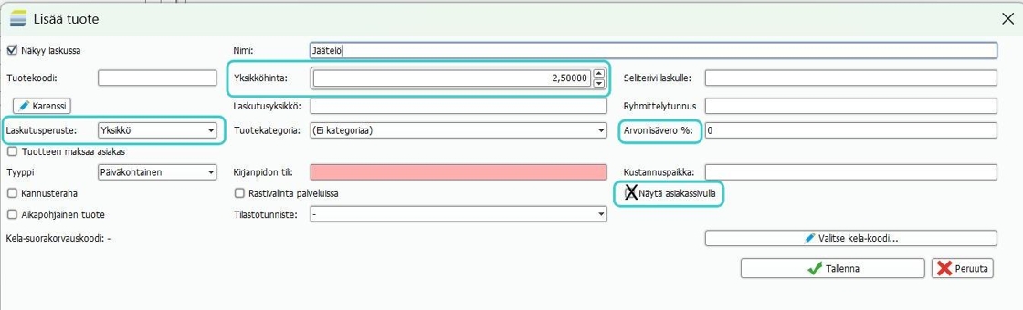 Näytä asiakassivulla: Mikäli haluatte laskuttaa tuotteita kertalaskuilla tai lisätä käsin asiakaskortin kautta tai suoraan palvelukoosteelta, niin tässä tulee olla ruksi, muuten tuote ei tule näkyviin valittavaksi.