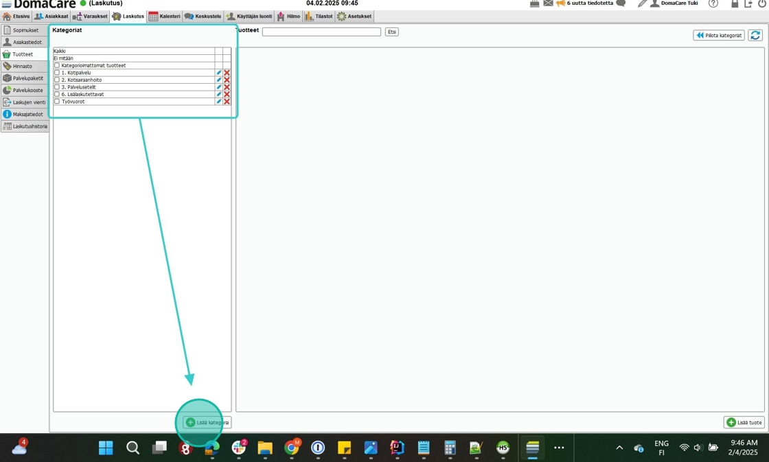 Voit nimetä tuotekategoriat sinisen kynän kautta uudestaan tai luoda tarvittaessa lisää uusia. Punaisesta ruksista voi poistaa turhat kategoriat.