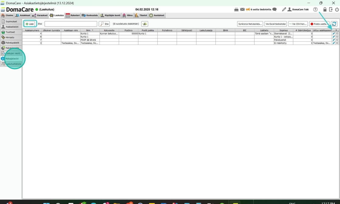DomaCare tallentaa kaikki DomaCareen luodut Asiakkaat automaattisesti maksajat välilehdelle, mutta kolmannen osapuolen laskutustiedot pitää luoda Maksajat -osioon erikseen.