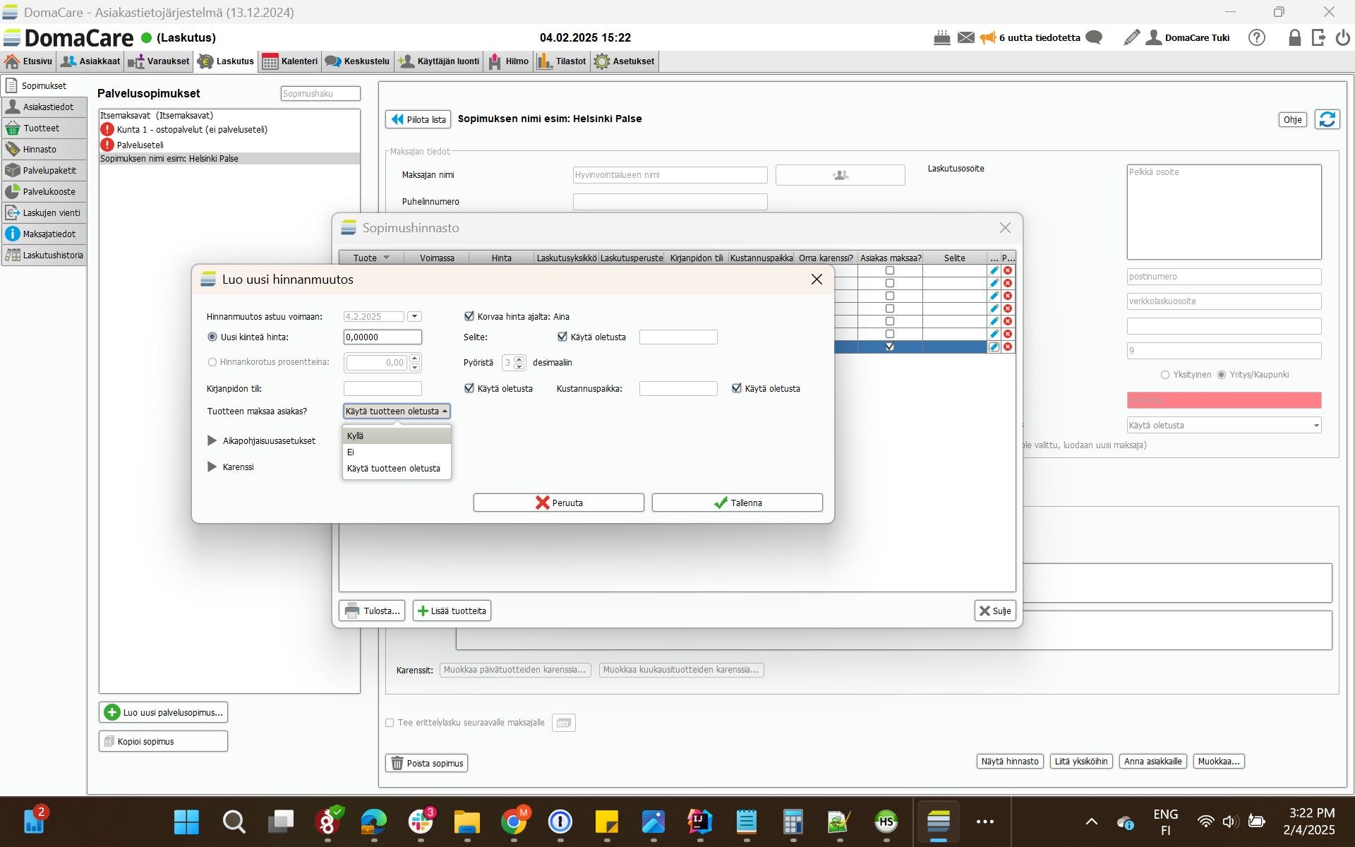 13. DomaCaressa asiakkaalla voi olla vain 1 sopimus, joten kaikki asiakkaalle myytävät palvelut tulee löytyä samalta sopimukselta /hinnastosta.