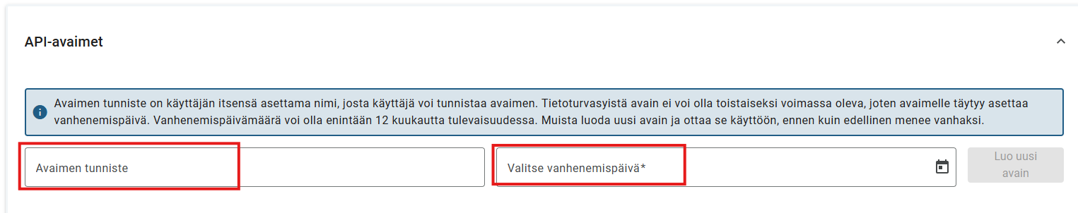Avaimen nimeämisen ja päiväyksen syöttämisen jälkeen aktivoituu oikealla puolella oleva Luo uusi avain -painike.