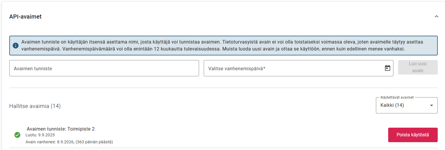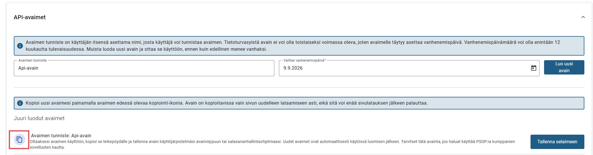 Mikäli avain jää kopioimatta, tulee API-avain luoda uudelleen.