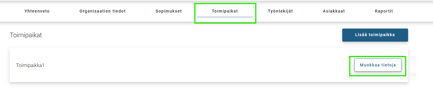 Siirrytään kohtaan Toimipaikat, jossa luodaan rajapintaa varten tunnistetiedot.