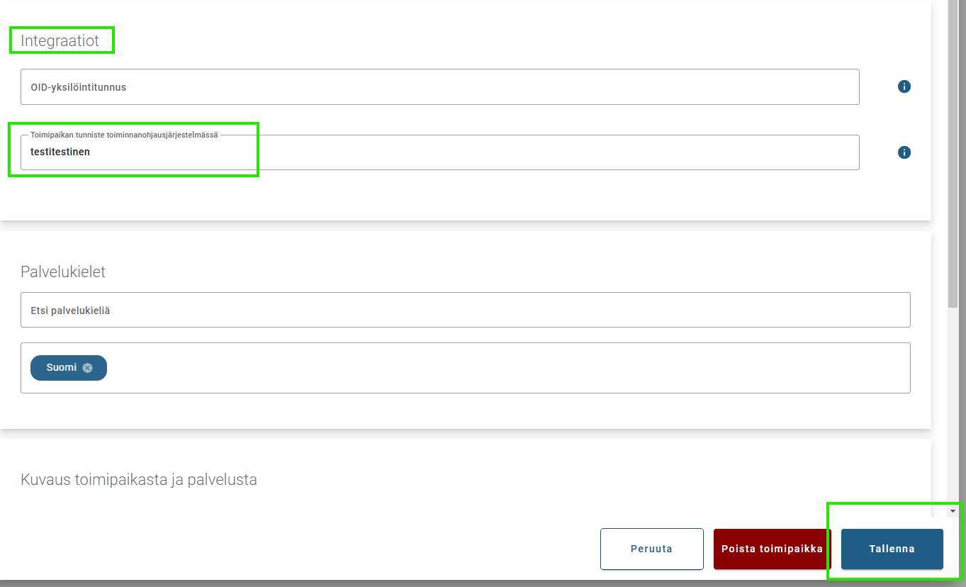 Toimipaikan tunniste: Sama tunnus, joka määritettiin Toimipaikan tunniste toiminnanohjausjärjestelmässä -kohtaan parastapalvelua.fi:ssä.