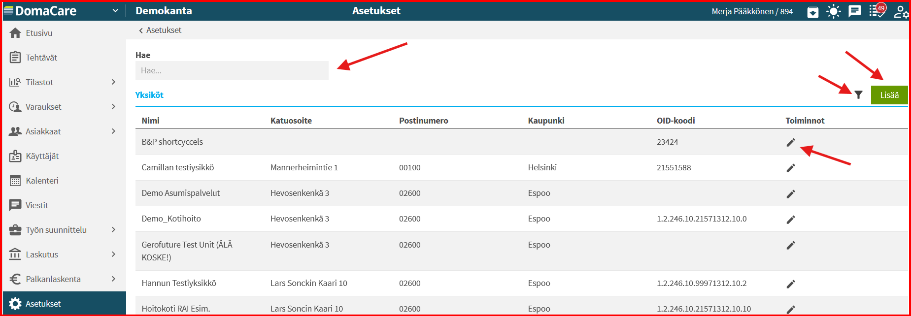 - Yksikkö tulee olla olemassa vähintään yhtä monta, kuin koodistopalvelussa on palveluyksiköitä. Domacare-ohjelmassa jokaisella yksiköllä voi olla vain yksi OID, mutta sama OID voi olla käytössä useassa yksikössä.