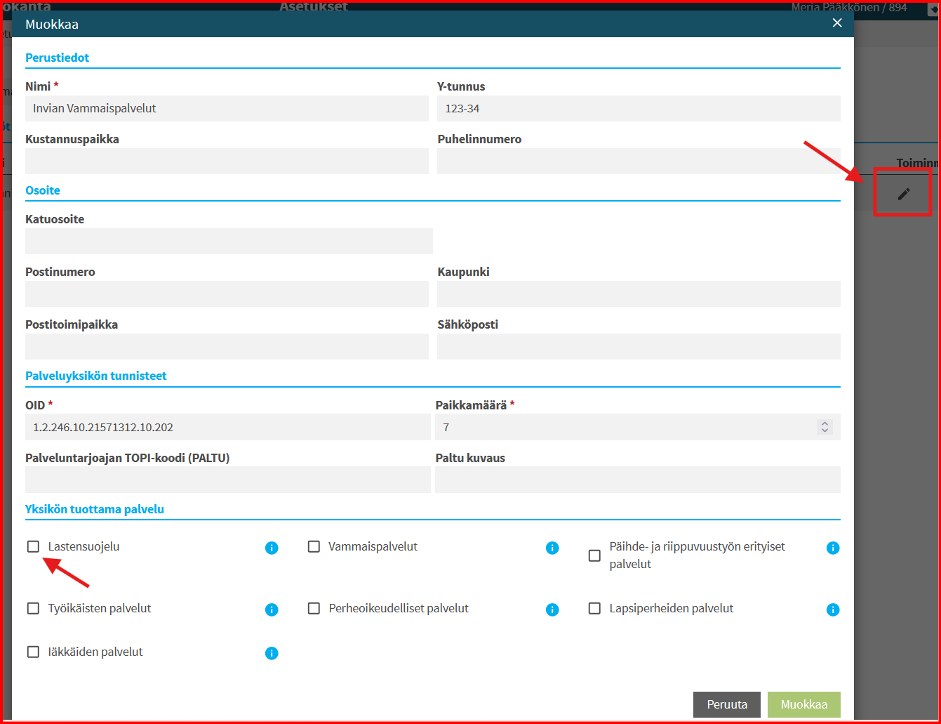 "Kynä"-ikonia klikkaamalla voit muokata olemassa olevan yksikön tietoja. Varmista, että yksikön perustiedot ovat oikein.