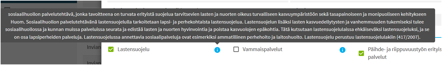 Yksikön tuottama palvelu = Palvelutehtävä : Tässä valitaan yksikön tuottama palvelutehtävä, mikä vaikuttaa sosiaalivarannon asioiden näkyvyyteen. Laita rastit oikeisiin palvelutehtäviin. Sinisestä infosta löydät vielä tarkennuksia. Vie hiiri infokuvakkeen päälle, niin avautuu kuvaus.t