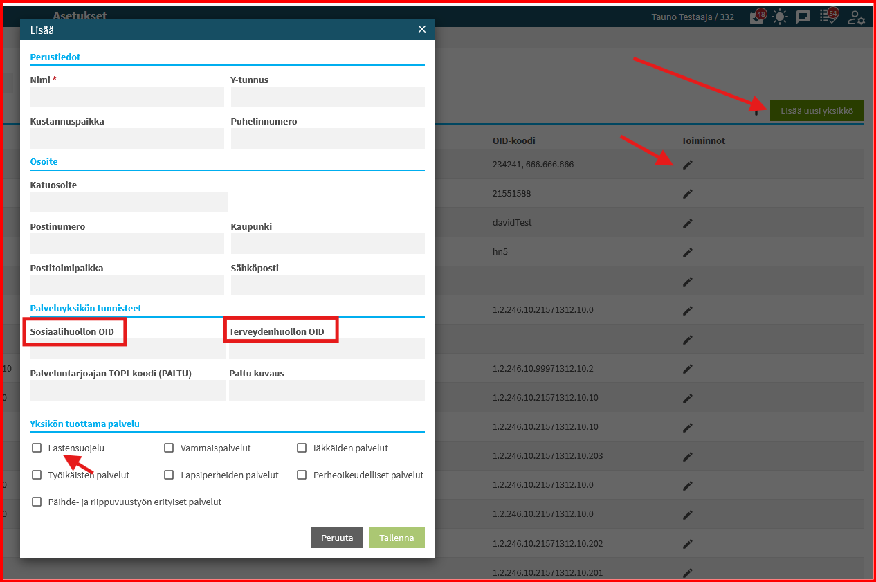 On erittäin tärkeää, että yksikön OID-tiedot ovat oikein, eli sama palveluyksikön OID, jonka olet ilmoittanut Hyvinvointialueelle. Tähän EI tule toimintayksikön OID:ia.