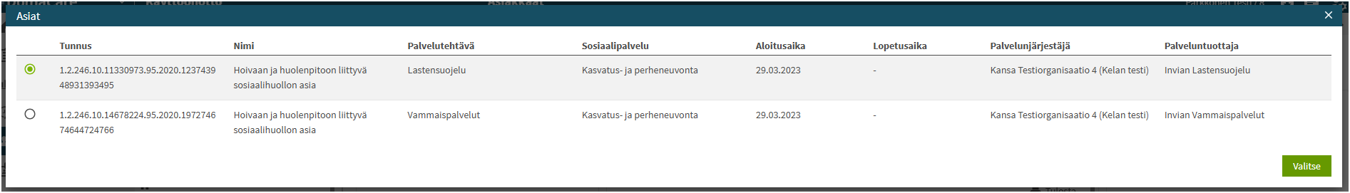 Kun asiakkakkuus on avattu Rekisterinkäyttöoikeuden avaaminen jälkeen ohjelma kysyy asian valintaa, jos asiakkaalla on useita palvelutehtäviä ja käyttäjällä on oikeudet näihin. Käyttäjä valitsee silloin kyseisessä valikossa oikean asian, jonka tietoihin hän siirtyy.