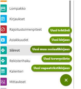 Kun käyttäjä tekee uutta kirjausta asiakkaalle, hän valitsee vihreästä pallurasta avautuvasta valikosta "Uusi muu sosiaalikirjaus." Jotta kirjaus voidaan tehdä sosiaalihuollon varantoon, pääkäyttäjien tulee muokata symbolieditorilla symbolit menemään asiakastietovarantoon. Tämä edellyttää Symbolipuun muokkaaminen