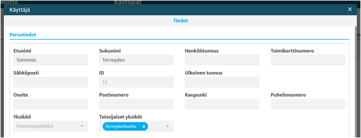 Käyttäjän perustiedot nousevat DC1 tietojen mukaan. Kaikkia tietoja ei tässä vaiheessa pysty lisäämään DC2, kuten kotiyksikköä ja toissijaisia yksiköitä.