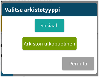 Avautuvasta ikkunasta valitaan, meneekö kirjaus asiakasvarantoon. Sosiaali-valinnasta avautuvat symbolit, jotka menevät sosiaalihuollon asiakastietovarantoon.