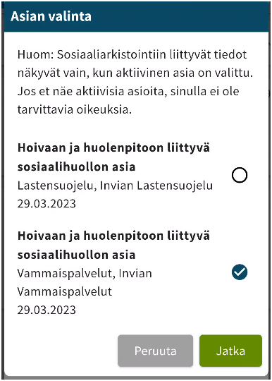 Jos DC2:ssa ei ole valittu aktiivista asiaa, mobiilisovelluksessa ei voi tehdä valintaa. Tämä estää kirjausten ohjaamisen sosiaalihuollon varantoon, joten varmista ensin, että DC2:ssa on asetettu aktiivinen asia.