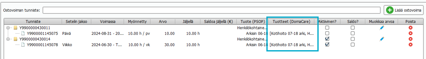 Taulukkoon tulee näkyviin tämän lisäksi voimassaoloaika, myönnetty määrä, arvo, jäljellä oleva saldo/määrä ja PSOP:n sekä DomaCaren tuote.