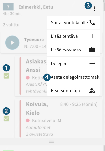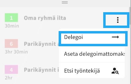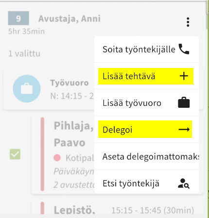 Työntekijän nimen perässä olevasta kolmen pisteen valikosta löytyy delegointi toiminnot