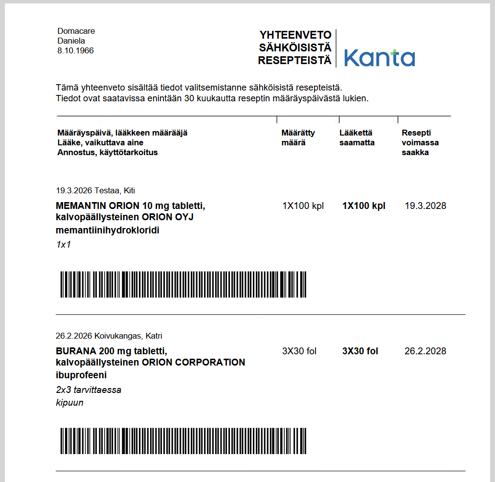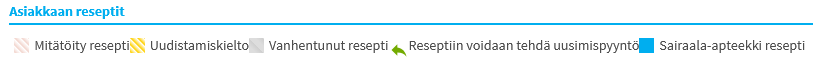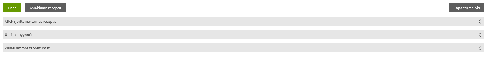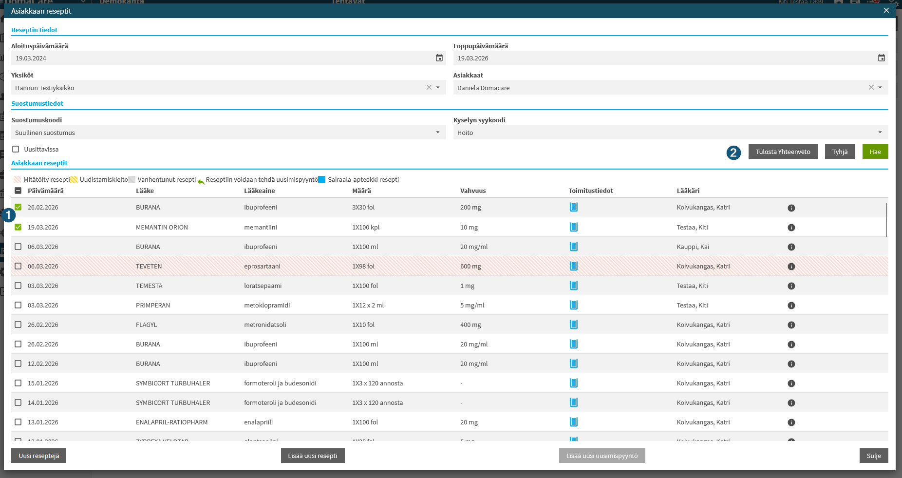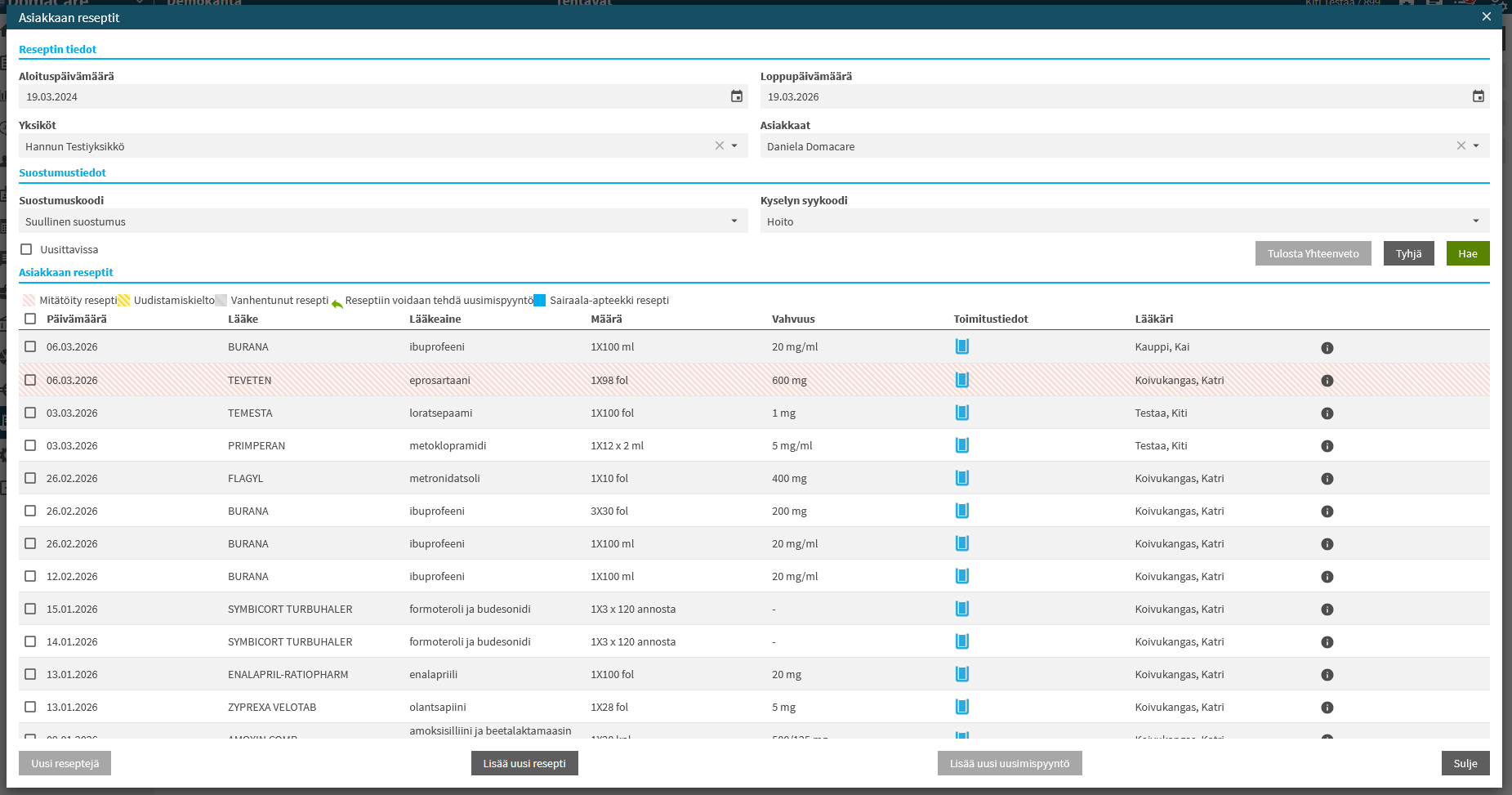 Tässä näkymässä voit tarkastella asiakkaan lääkemääräyksiä, uusia reseptejä, kirjoittaa uuden reseptin, lisätä reseptin uusimispyynnön ja tulostaa yhteenvetoja halutuista lääkkeistä.