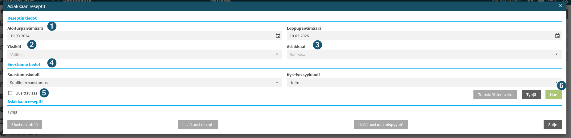 - Uusittavissa olevat reseptit: Jos haet vain uusittavissa olevia reseptejä, valitse Uusittavissa-kohta.