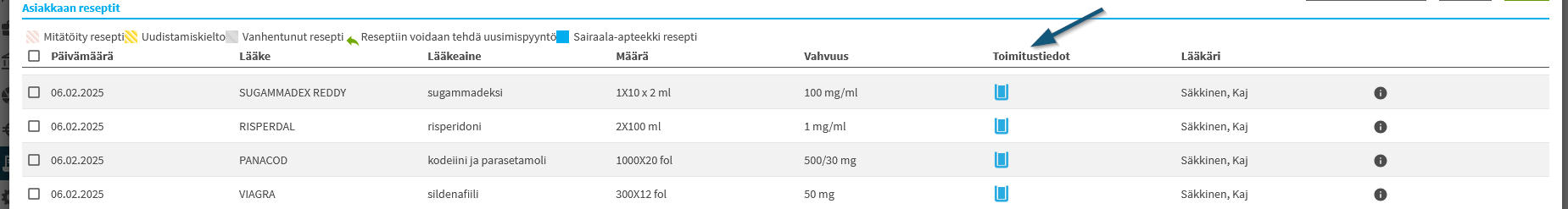Reseptin toimitustilanteen näet lääkkeen rivillä Toimitustiedot-kohdasta