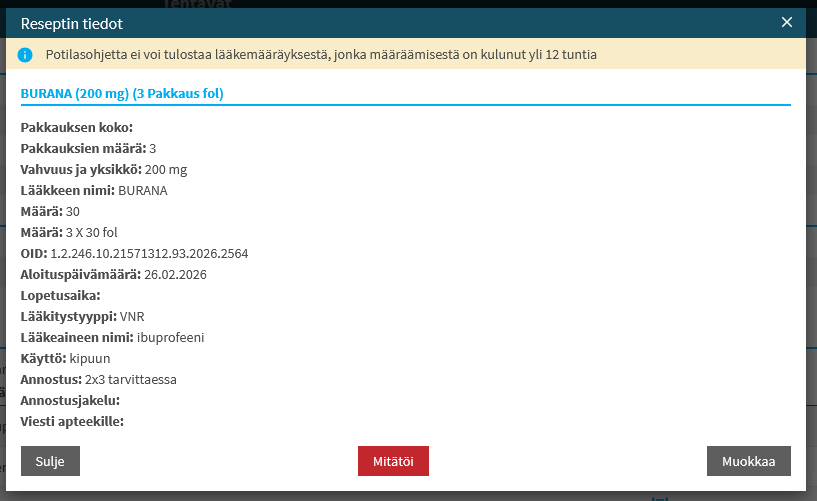 Tästä näkymästä voit mitätöidä reseptin ja muokata reseptiä. Lisäksi voit tulostaa potilasohjeen, jos lääkemääräyksestä on kulunut alle 12 tuntia.