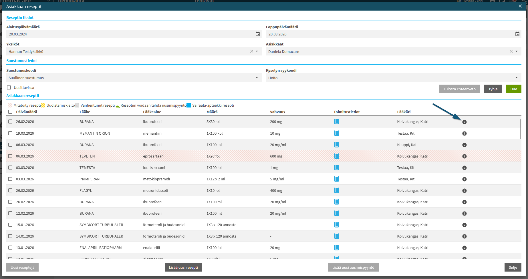Voit mitätöidä reseptin Asiakkaan reseptit-näkymässä. Hae asiakkaan reseptit täältä löytyvän ohjeen mukaan.