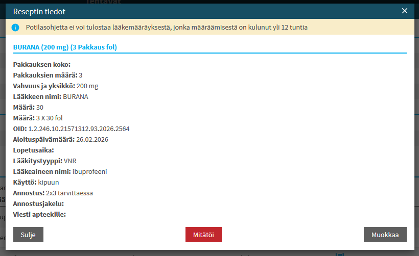 Paina mitätöitävän reseptin riviltä i-painiketta.