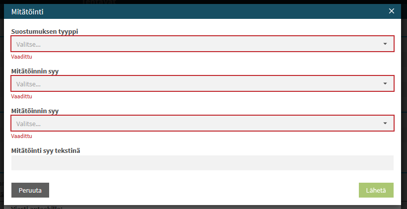 Täytä Mitätöinti-ikkunassa suostumukseen ja mitätöintiin liittyvät tiedot. Pakolliset kentät on merkitty punaisella.