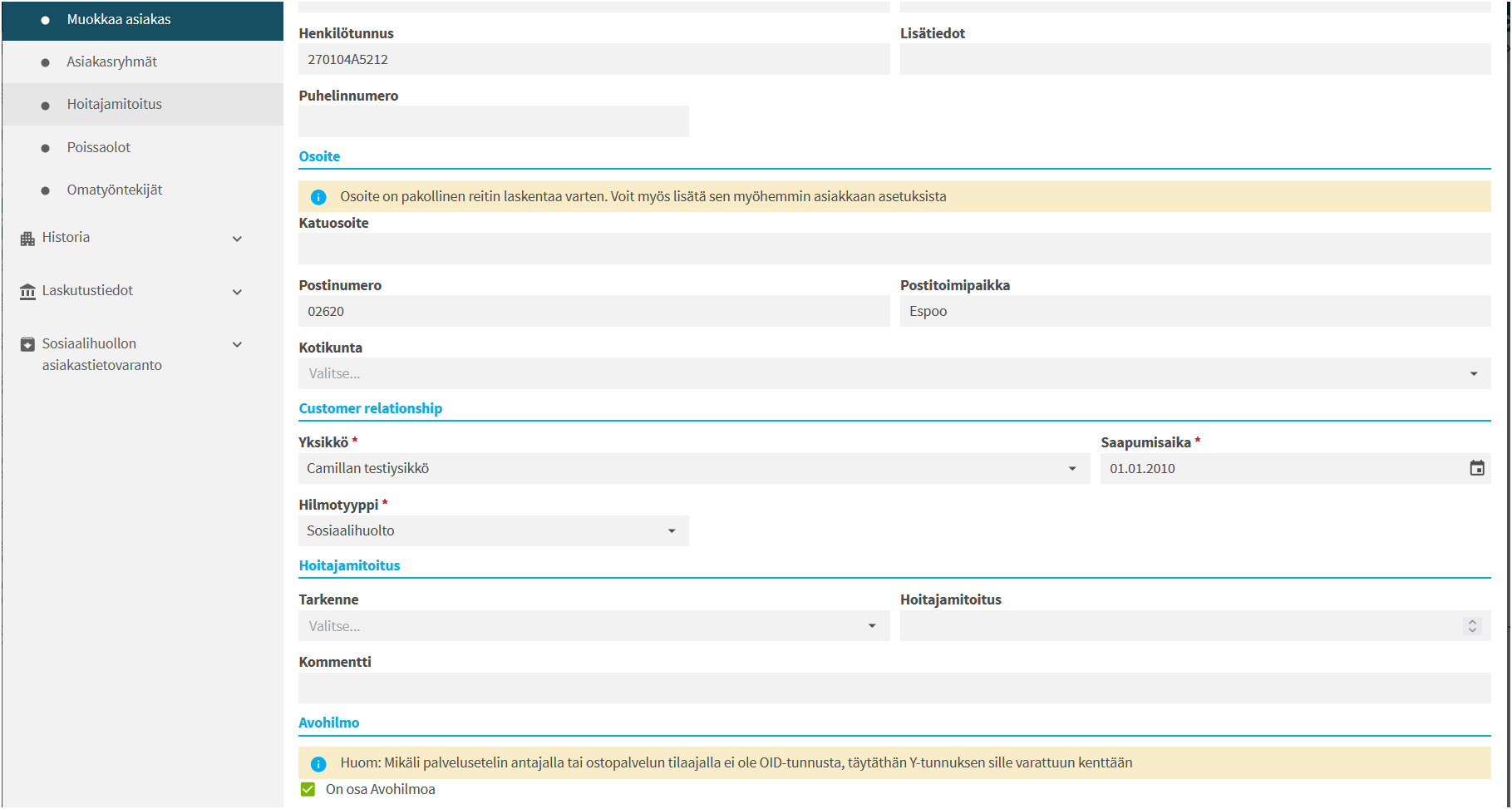 Ja tallennetaan ostopalvelun tilaajan ja palvelustelin antajan OID-tunnukset ja y-tunnukset pakollinen tieto
