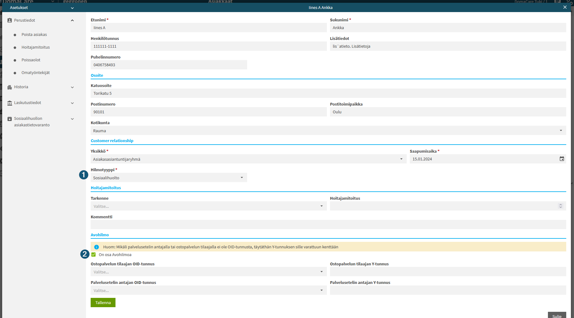 Jotta asiakkaasta voidaan lähettää tiedot sekä sosiaalihuollon Hilmoon että Avohilmoon, toimi seuraavasti: